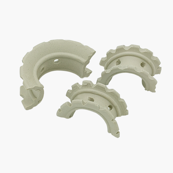 陶瓷異鞍環(huán)填料是在矩鞍環(huán)填料的基礎(chǔ)上加以改進的新型填料,將矩鞍填料的平滑弧形側(cè)面改為鋸齒形或紋紋凸起的側(cè)面。這樣在填料床層內(nèi),增加了填料間接觸的空隙,使之更有利于氣體和液體在填料層中的流動和擴散。